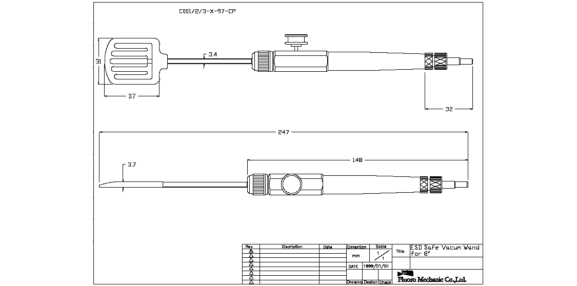 Complete vacuum wand including tip for wafer handling. ESD safe conductive nylon body. Normally open push-button valve (press to release the wafer). Vacuum is automatically switched off when placed in stand 658 or 659. The tip can be rotated, swivelled up to 30° and locked. Suitable for up to 8 inch (200 mm) wafer handling. With conductive PEEK tip. Wand body and tip available separately. The vacuum tube connector allows push-on connection to any flexible tubing from 2.5 mm to 4 mm ID. The tube connector has a quick connection feature that allows wands to be interchanged rapidly.