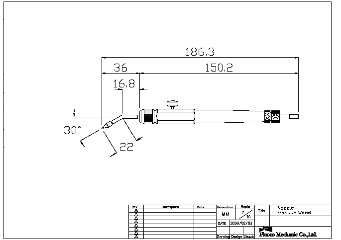 Vacuum wand without tip for handling small objects, including semiconductor dies, components, etc. Manufactured from PTFE. The valve is normally closed, so press the button to pick up. The vacuum tube connector allows push-on connection to any flexible tubing from 2.5 mm to 4 mm ID. Flexible tubing is available for use with this wand (part numbers 851-L, 851-M and 850-M). The tube connector has a quick connection feature that allows wands to be interchanged rapidly. Compatible with all nozzles, suction cups and slit tips (shown with typical nozzle).